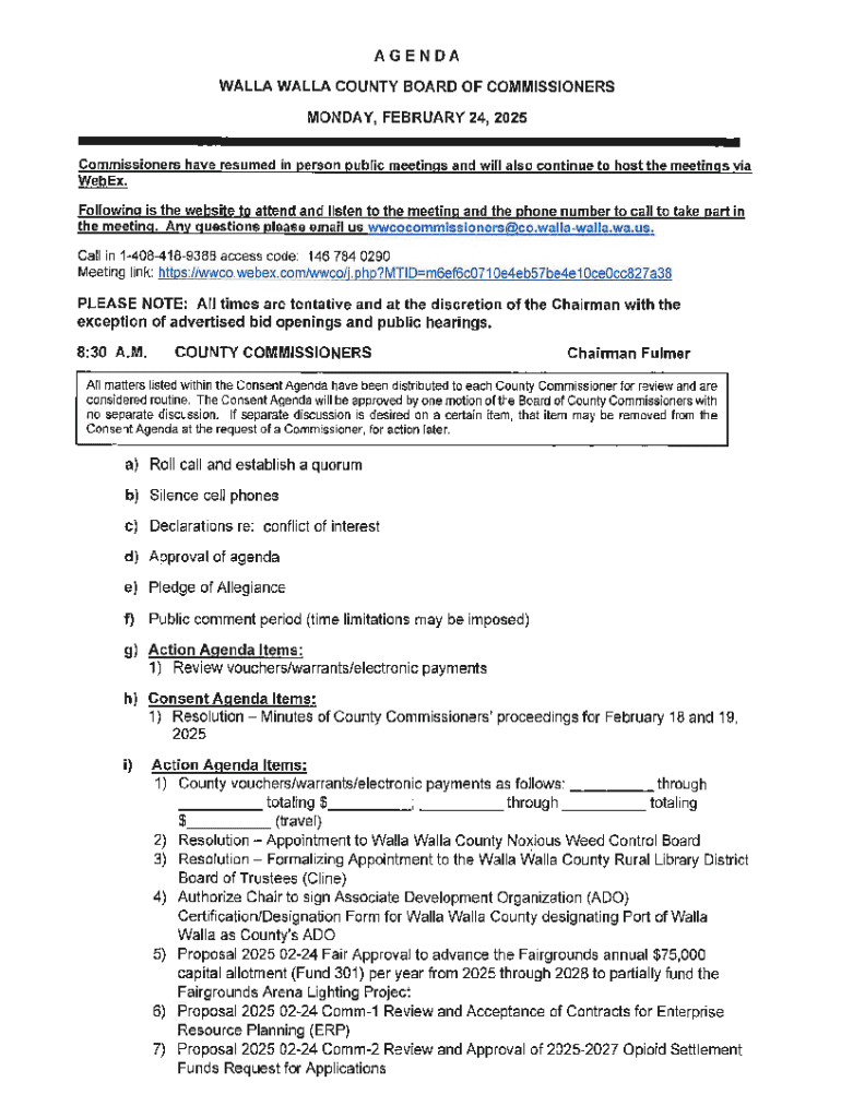 Get the free Walla Walla County Board of Commissioners Meeting Agenda