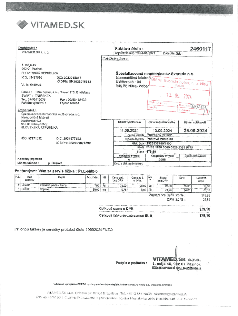 Dodvatel\'Faktraslo: __ ___ _ 2460\"17 Objenvkais:20248UO3\'jDomcNiis*+\"\':VlTAMED.SKs. r. o. Potov\'adresa:1. mja 45 9.02 l Pezinok SLOVENSKApeaiali\'zovar Nemo(;inREPUBLIKAoi:IO: 4.5487090zozsassqs