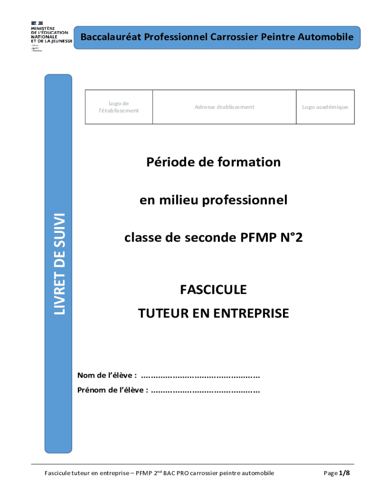 Baccalaurat Professionnel Carrossier Peintre AutomobileLogo de ltablissementAdresse tablissementLogo acadmiquePriode de formationLIVRET DE SUIVIen milieu professionnel classe de seconde PFMP N2FASCICULE