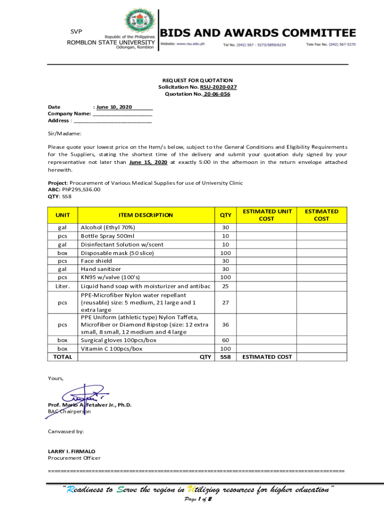 This document is a request for quotation for the procurement of various medical supplies for the University Clinic, including details on item descriptions, quantities, estimated costs, delivery periods,