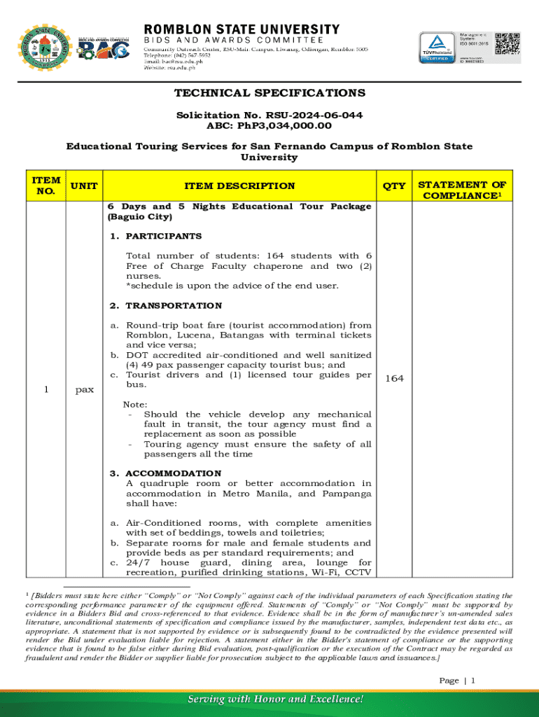 TECHNICAL SPECIFICATIONS Solicitation No. RSU202406044 ABC: PhP3,034,000.00 Educational Touring Services for San Fernando Campus of Romblon State University ITEM UNIT NO.ITEM DESCRIPTIONQTYSTATEMENT