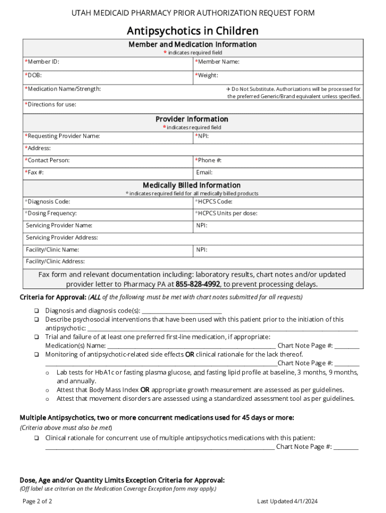 To fill out a Utah Medicaid Pharmacy Prior Authorization, providers must complete a form that includes patient information, medication details, medical necessity justification, and any relevant clinical information supporting the request.