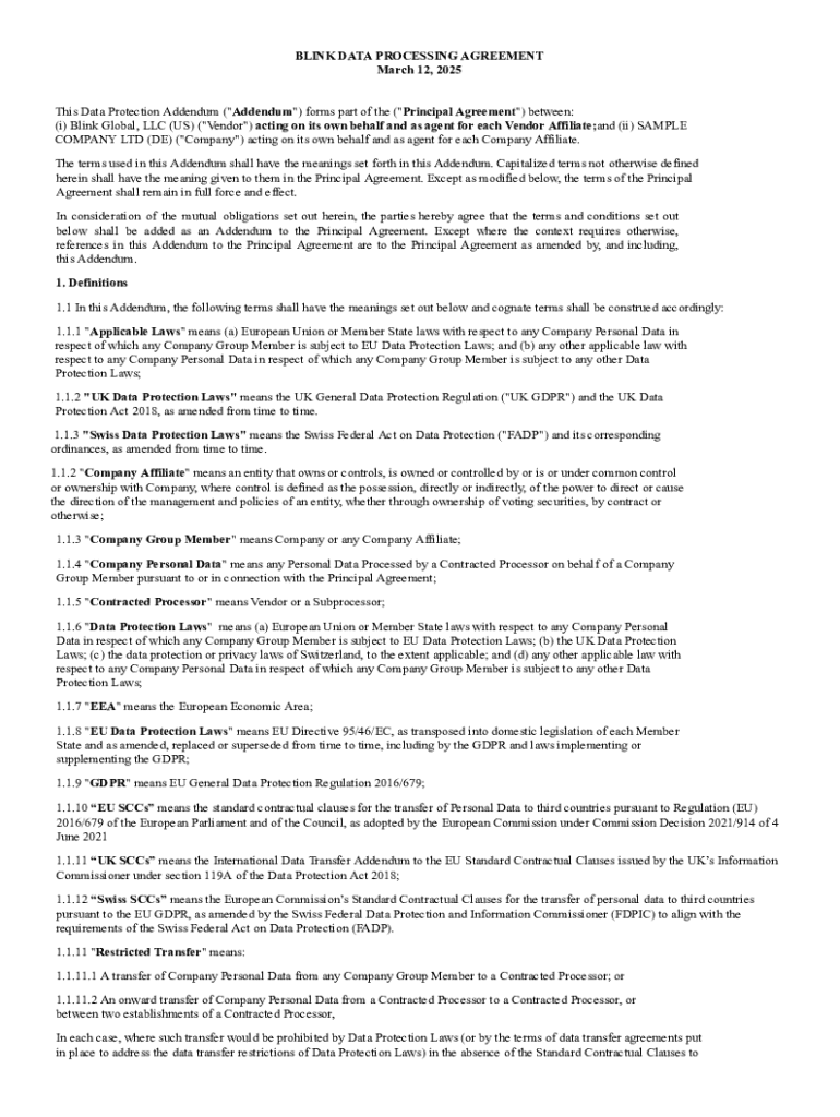 This Data Protection Addendum serves as an agreement between Blink Global, LLC and SAMPLE COMPANY LTD pertaining to the processing of personal data under various applicable laws. It outlines the obligations