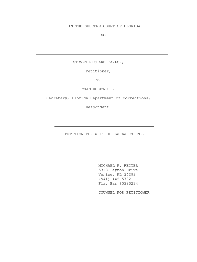 IN THE SUPREME COURT OF FLORIDA NO. STEVEN RICHARD TAYLOR, Petitioner, v. WALTER McNeil, Secretary, Florida Department of Corrections, Respondent. PETITION FOR WRIT OF HABEAS CORPUS MICHAEL P. RECITER