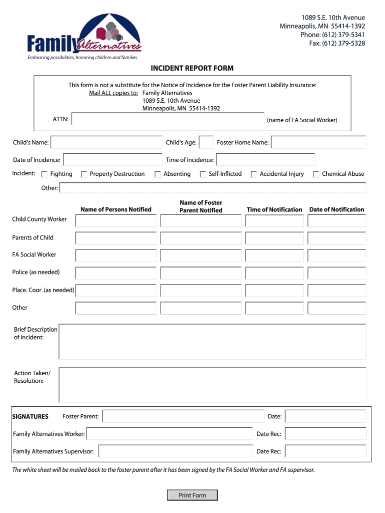 1089 S.E. 10th Avenue Minneapolis, MN 55414-1392 Phone: (612) 379-5341 Fax: (612) 379-5328 Embracing possibilities, honoring children and families. INCIDENT REPORT From This form is not a substitute