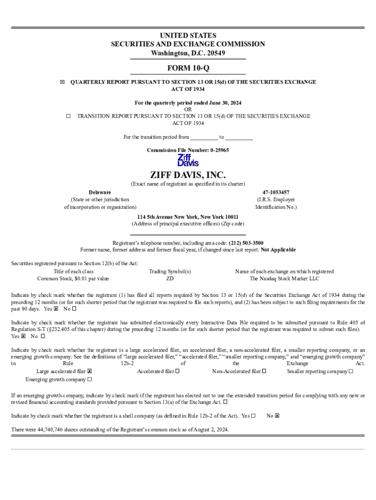 This document is a quarterly report for Ziff Davis, Inc. for the period ended June 30, 2024, detailing financial performance, management discussion, and other relevant information concerning the company\'s