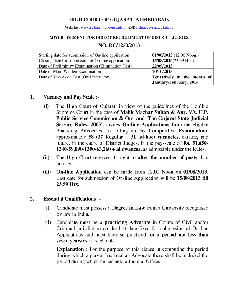 Get the free NO. RC/1250/2013 1. Vacancy and Pay Scale - High Court of Gujarat