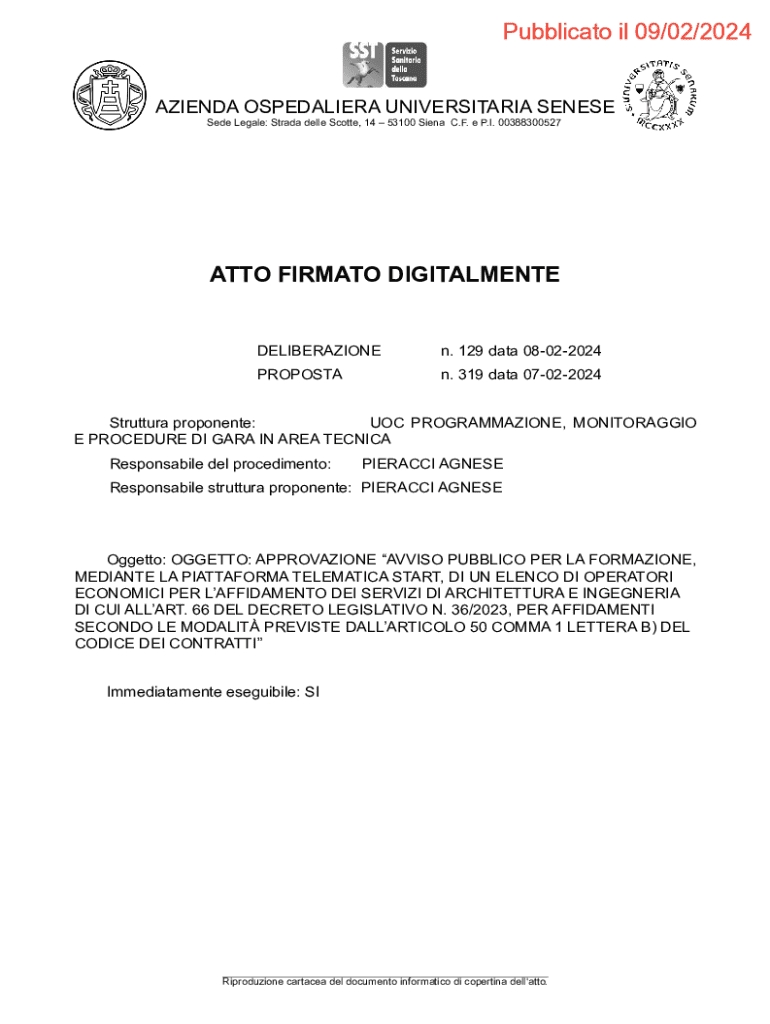 Pubblicato il 09/02/2024 AZIENDA OSPEDALIERA UNIVERSITARIA SENESE Sede Legale: Strada delle Scotte, 14 53100 Siena C.F. e P.I. 00388300527ATTO FIRMATO DIGITALMENTEDELIBERAZIONEn. 129 data 08022024PROPOSTAn.