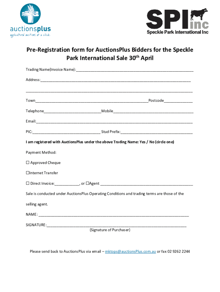 This form is used for pre-registering bidders for the Speckle Park International Sale, scheduled for 30th April. It captures the bidder\'s trading name, address, contact information, and payment method