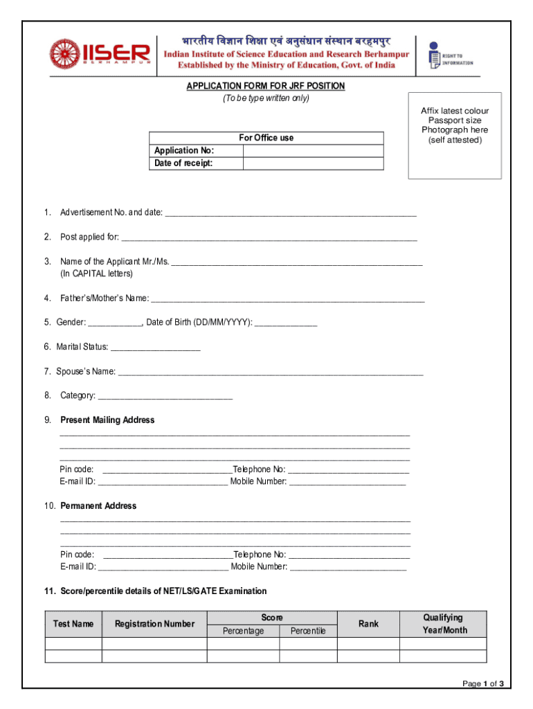 Este formulario debe ser escrito a máquina y se utiliza para solicitar la posición de JRF. Incluye información personal, detalles académicos y de experiencia laboral, así como la verificación