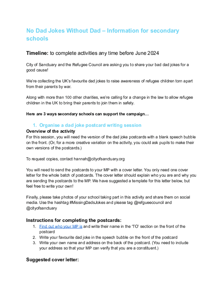 This document provides information for secondary schools on how to participate in the \'No Dad Jokes Without Dad\' campaign, which aims to raise awareness for refugee children separated from their