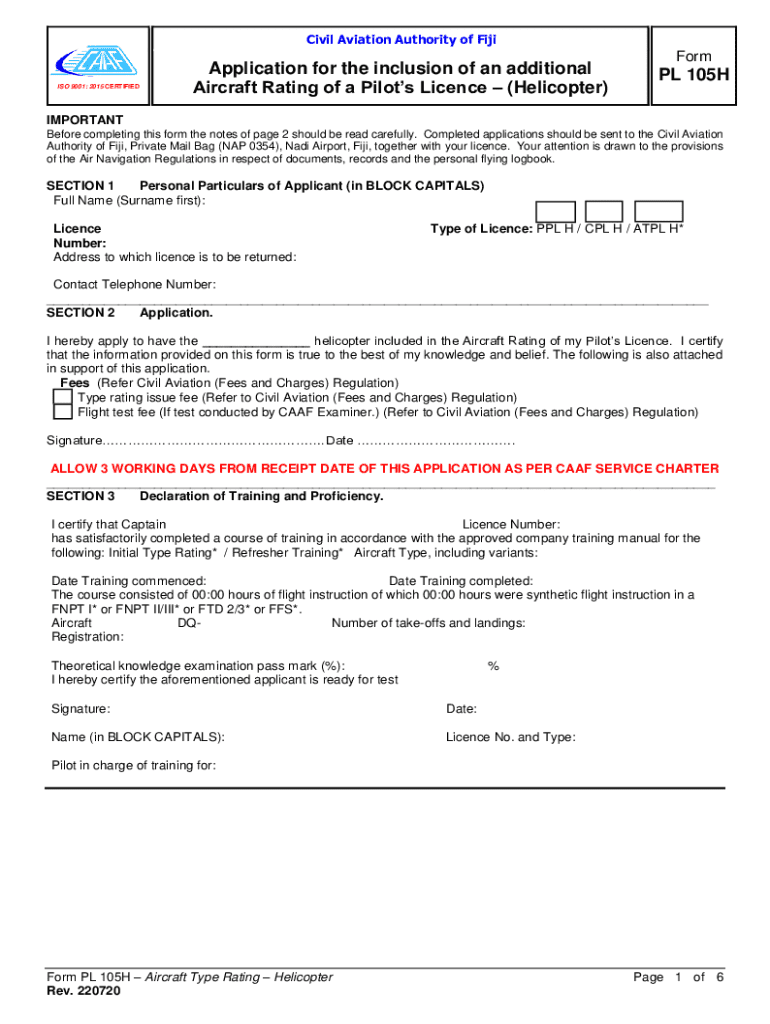Application form for pilots to add an additional helicopter rating to their licence, including personal details, training declaration, fees, and flying experience declaration.