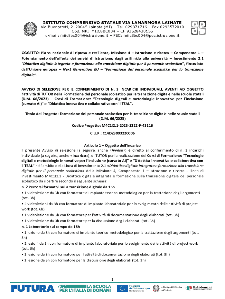 ISTITUTO COMPRENSIVO STATALE VIA LAMARMORA LAINATE Via Buonarroti, 220045 Lainate (MI) Tel 029371716 Fax 0293572010 Cod. MPI MIIC8BC004 CF 93528430155 email: miic8bc004@istruzione.it PEC: miic8bc004@pec.istruzione.itOGGETTO: