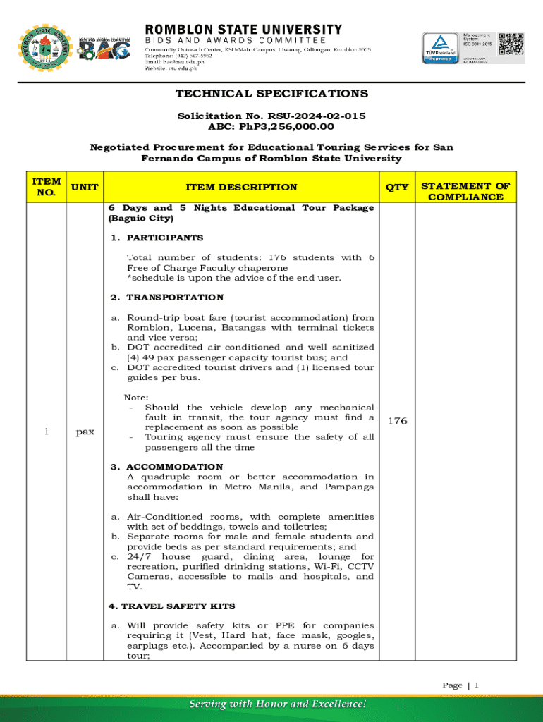 TECHNICAL SPECIFICATIONS Solicitation No. RSU202402015 ABC: PhP3,256,000.00 Negotiated Procurement for Educational Touring Services for San Fernando Campus of Romblon State University ITEM UNIT NO.ITEM
