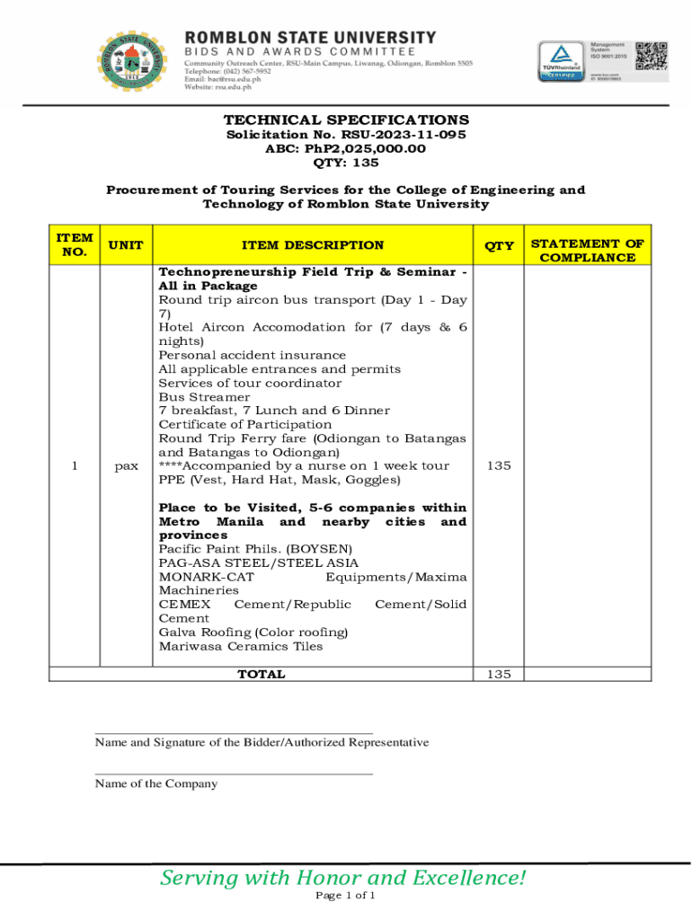 TECHNICAL SPECIFICATIONS Solicitation No. RSU202311095 ABC: PhP2,025,000.00 QTY: 135Procurement of Touring Services for the College of Engineering and Technology of Romblon State University ITEM NO.1UNITpaxITEM