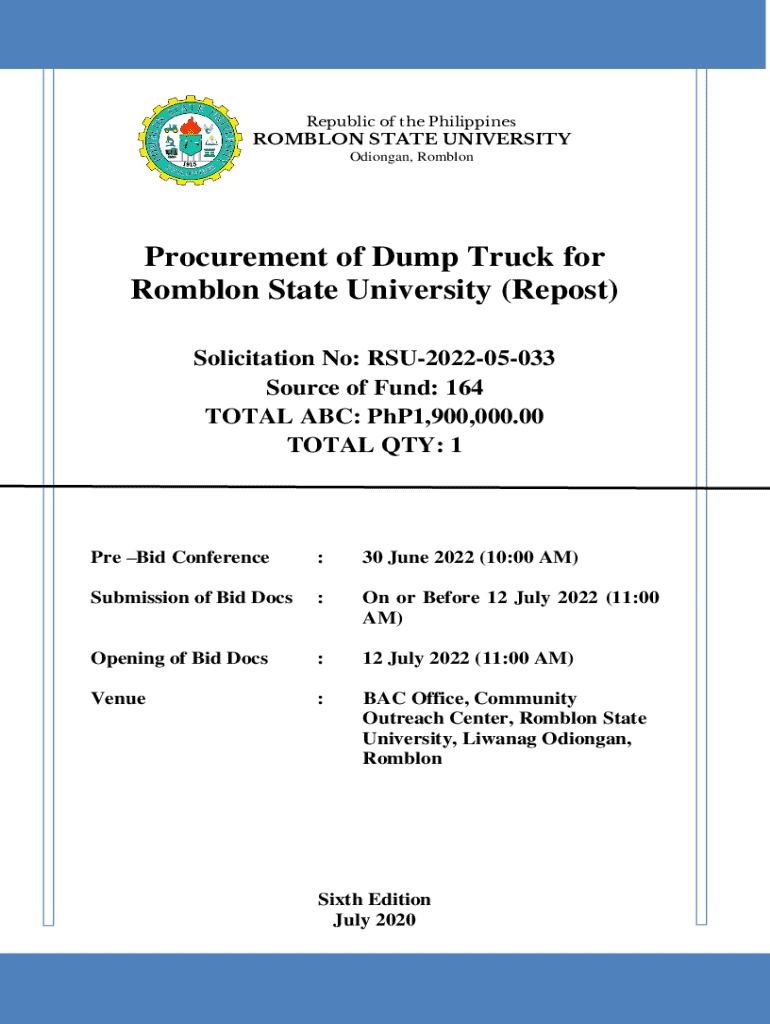 Republic of the PhilippinesROMBLON STATE UNIVERSITY Odiongan, RomblonProcurement of Dump Truck for Romblon State University (Repost) Solicitation No: RSU202205033 Source of Fund: 164 TOTAL ABC: PhP1,900,000.00