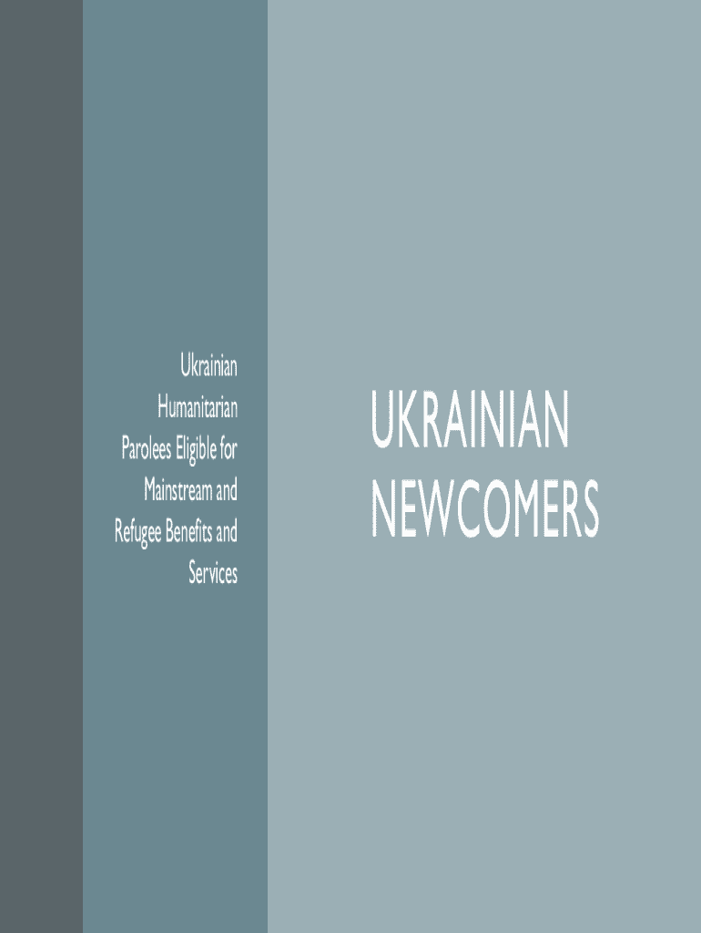 Ukrainian Humanitarian Parolees Eligible for Mainstream and Refugee Benefits and ServicesUKRAINIAN NEWCOMERSADDITIONAL UKRAINE SUPPLEMENTAL APPROPRIATIONS ACT, 2022 (AUSAA) As of May 21, 2022, the