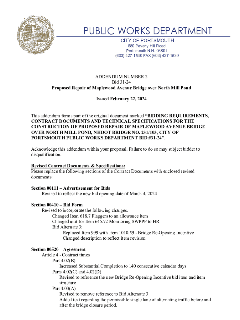This addendum is part of the original bidding requirements, contract documents, and technical specifications for the construction of the proposed repair of the Maplewood Avenue Bridge over North Mill