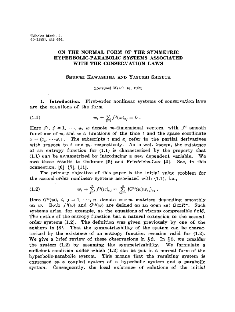 Thoku M ath. J . 40(1988), 449 464.ON THE NORMAL FORM OF THE SYMMETRIC HYPERBOLIC PARABOLIC SYSTEMS ASSOCIATED WITH THE CONSERVATION LAWS SHUICHI KAWASHIMA AND YASUSHI SHIZUTA (Received March 16,