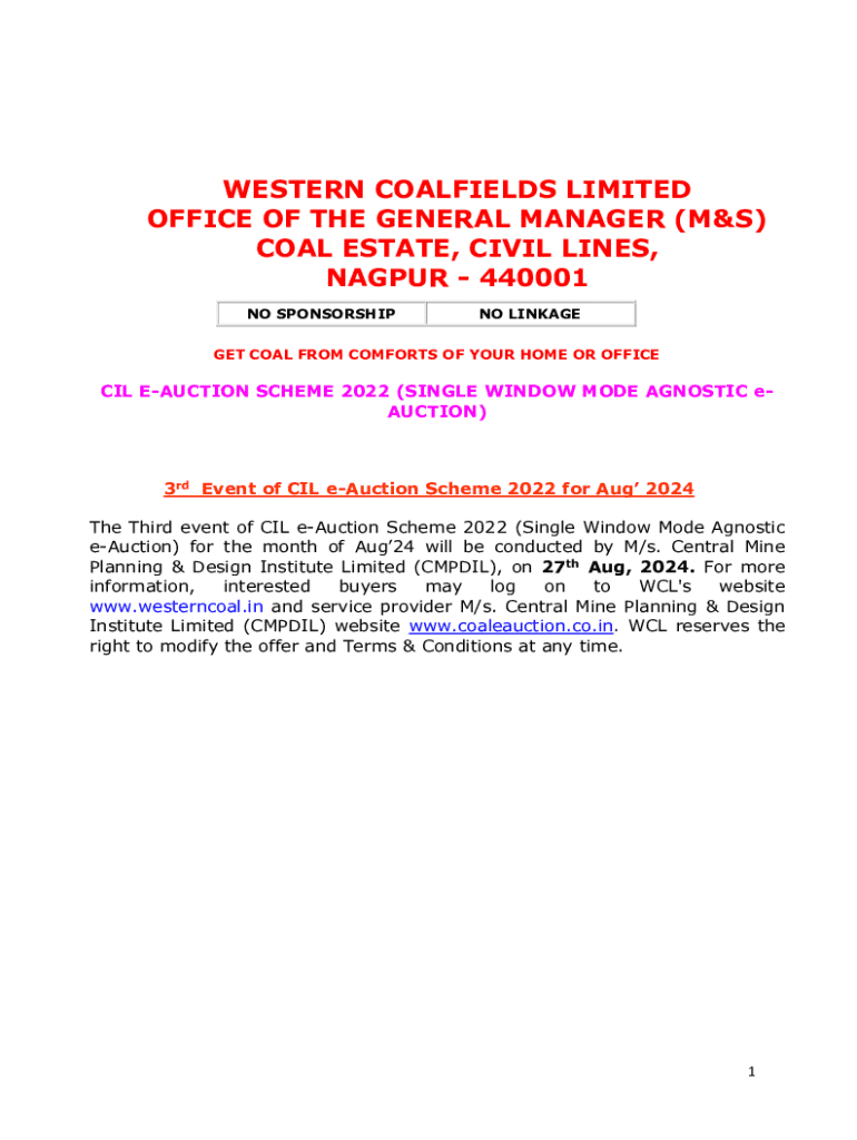 WESTERN COALFIELDS LIMITED OFFICE OF THE GENERAL MANAGER (M&S) COAL ESTATE, CIVIL LINES, NAGPUR 440001 NO SPONSORSHIPNO LINKAGEGET COAL FROM COMFORTS OF YOUR HOME OR OFFICECIL EAUCTION SCHEME 2022
