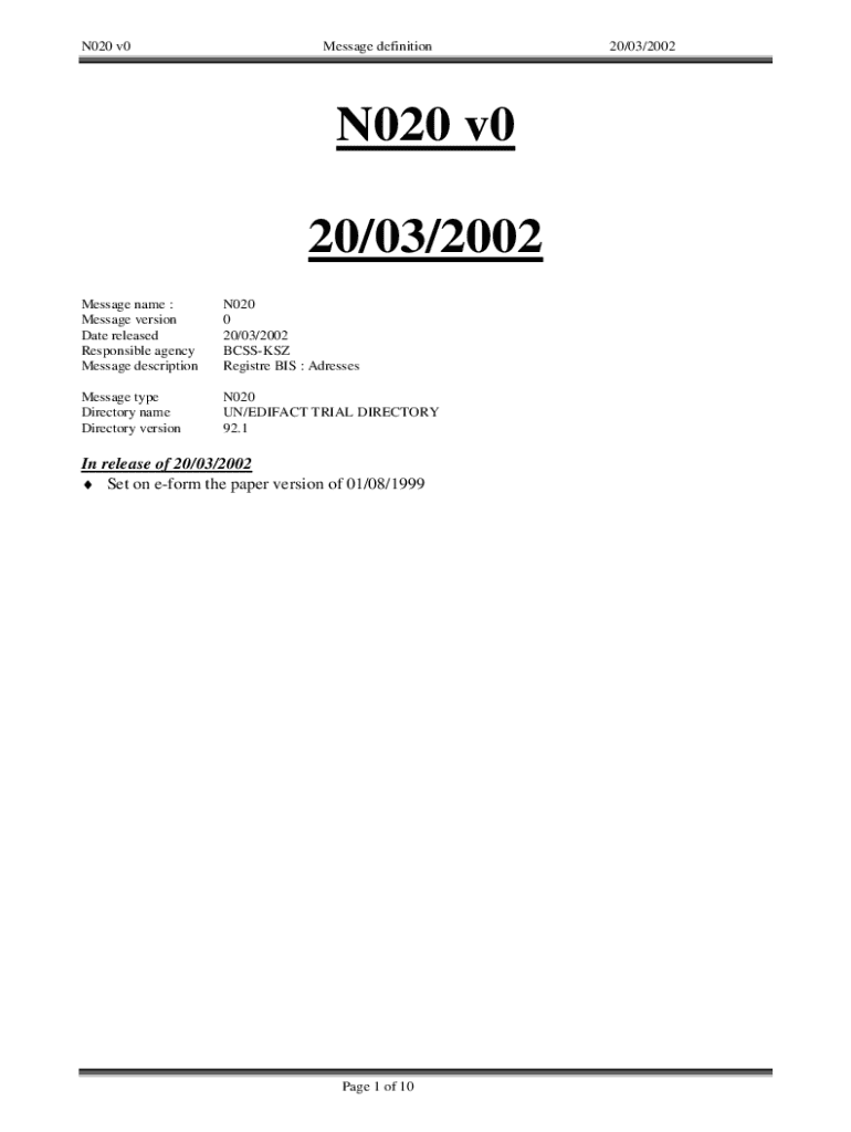 Défini le message N020, y compris les segments, la structure et les détails des adresses. Utilisé pour le registre BIS concernant les adresses dans le cadre des communications UN/EDIFACT.