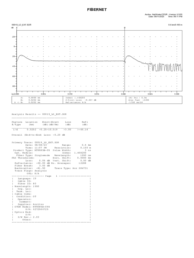 Document contains optical time-domain reflectometer (OTDR) analysis results for various fiber optic tests conducted using Anritsu equipment, detailing performance metrics such as overall loss, reflectance,
