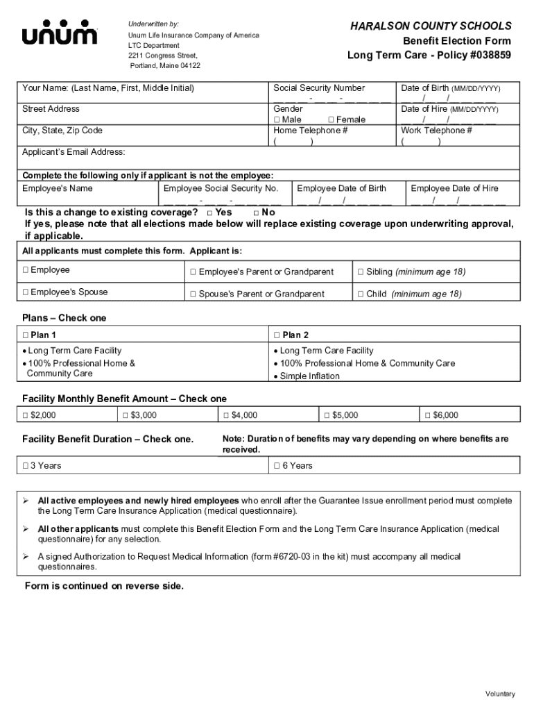 This form is used to elect coverage for Long Term Care insurance provided by Unum Life Insurance Company for employees and their eligible family members. It requires personal information and beneficiaries