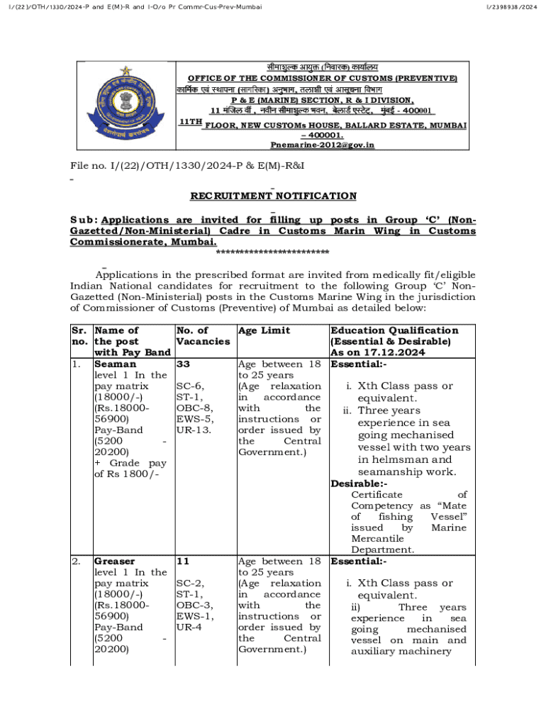 I/(22)/OTH/1330/2024P and E(M)R and IO/o Pr CommrCusPrevMumbaiI/2398938/2024 () OFFICE OF THE COMMISSIONER OF CUSTOMS (PREVENTIVE) ( ) , P & E (MARINE) SECTION, R & I DIVISION, 11 , , ,