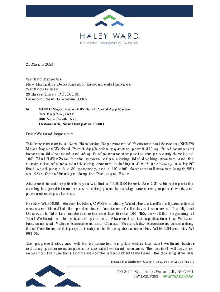 This document includes a permit application for a project involving the removal of an existing tidal docking structure and construction of a new tidal docking structure in Portsmouth, New Hampshire.