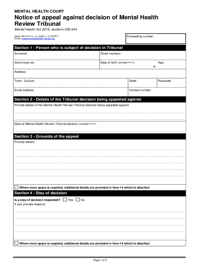 This form is used to appeal against a decision made by the Mental Health Review Tribunal under the Mental Health Act 2016. It includes sections for personal details, details of the decision being