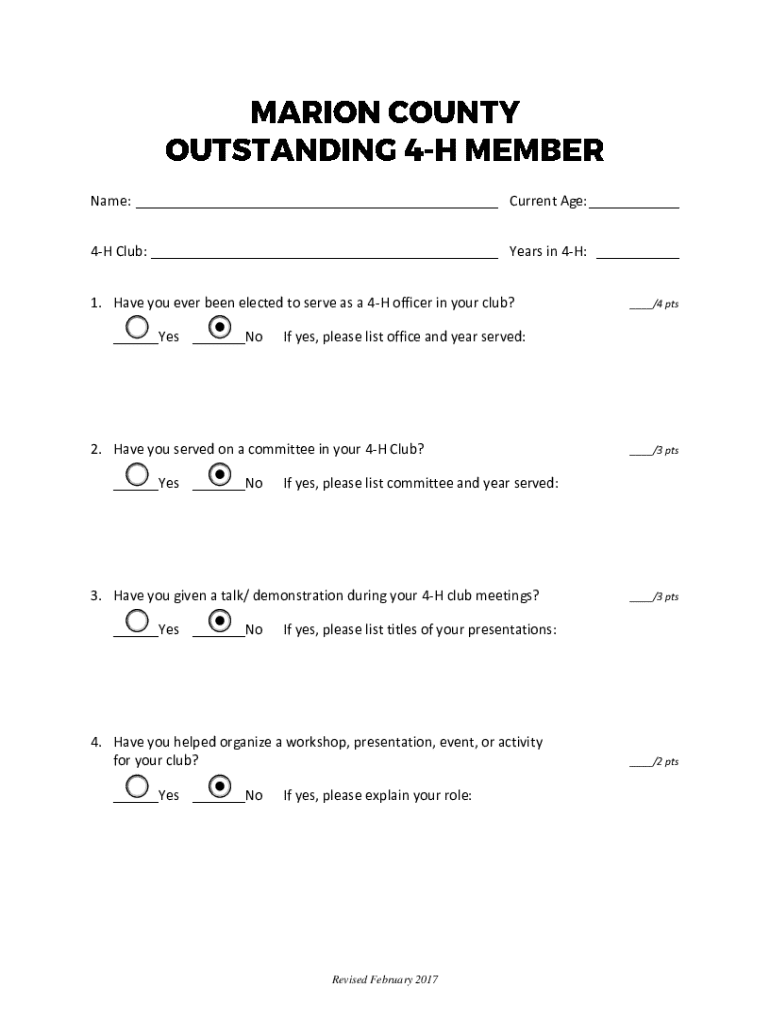 Name: ___ Current Age: ___ 4H Club: ___ Years in 4H: ___ 1. Have you ever been elected to serve as a 4H officer in your club? ___Yes ___NoIf yes, please list office and year served:2. Have you served