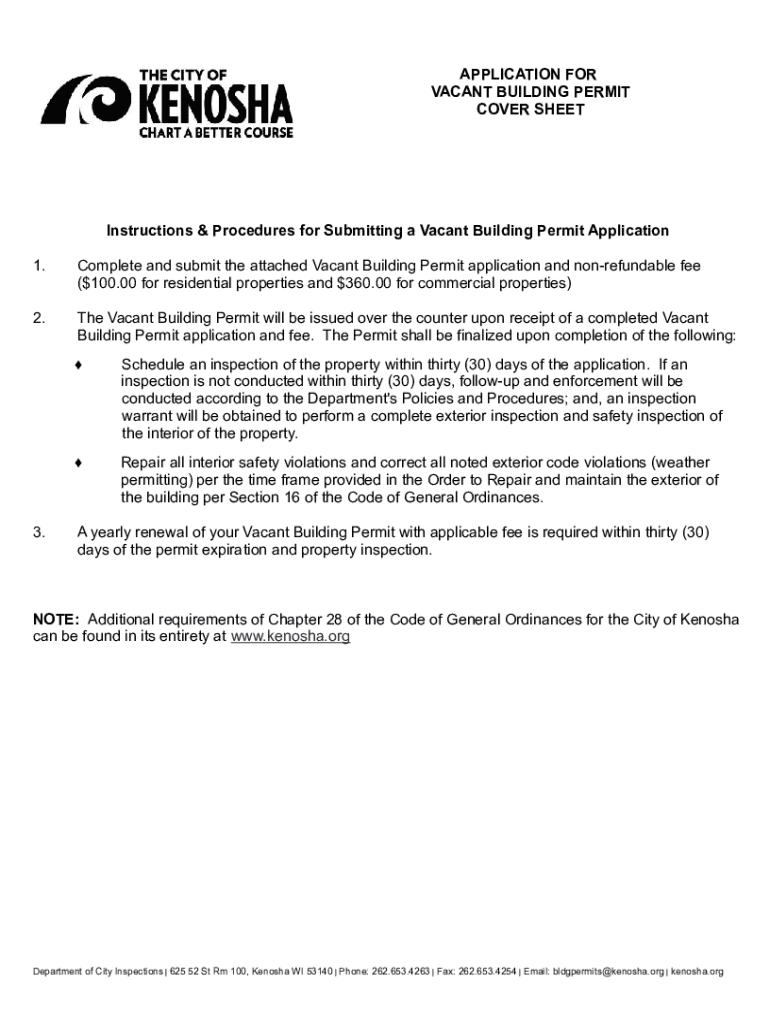 APPLICATION FOR VACANT BUILDING PERMIT COVER SHEETInstructions & Procedures for Submitting a Vacant Building Permit Application 1.Complete and submit the attached Vacant Building Permit application