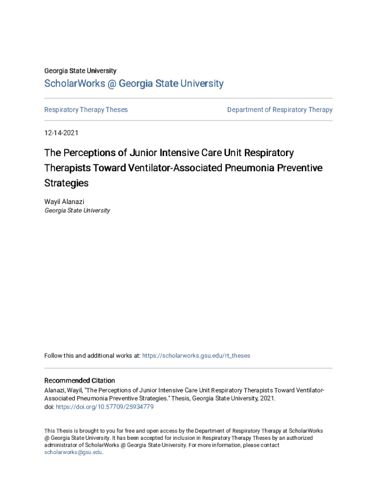 This thesis evaluates the perceptions of junior intensive care unit respiratory therapists regarding strategies to prevent ventilator-associated pneumonia (VAP). The study aims to assess both adherence