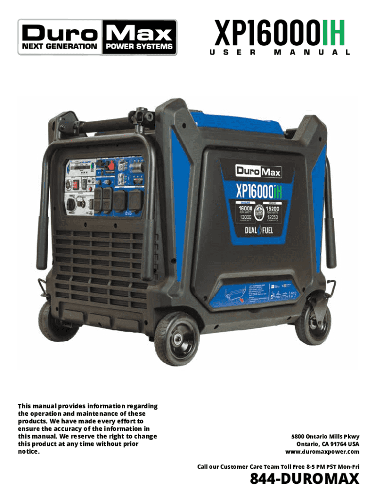 This manual provides information regarding the operation and maintenance of the DuroMax XP16000iH generator. It includes safety procedures, setup instructions, usage guidelines, maintenance schedules,