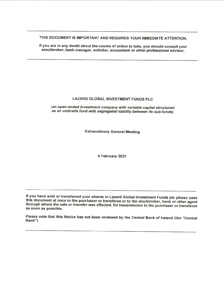 This document serves as a proxy form for shareholders of Lazard Global Investment Funds plc, allowing them to appoint a proxy to vote on their behalf at the Extraordinary General Meeting. It includes