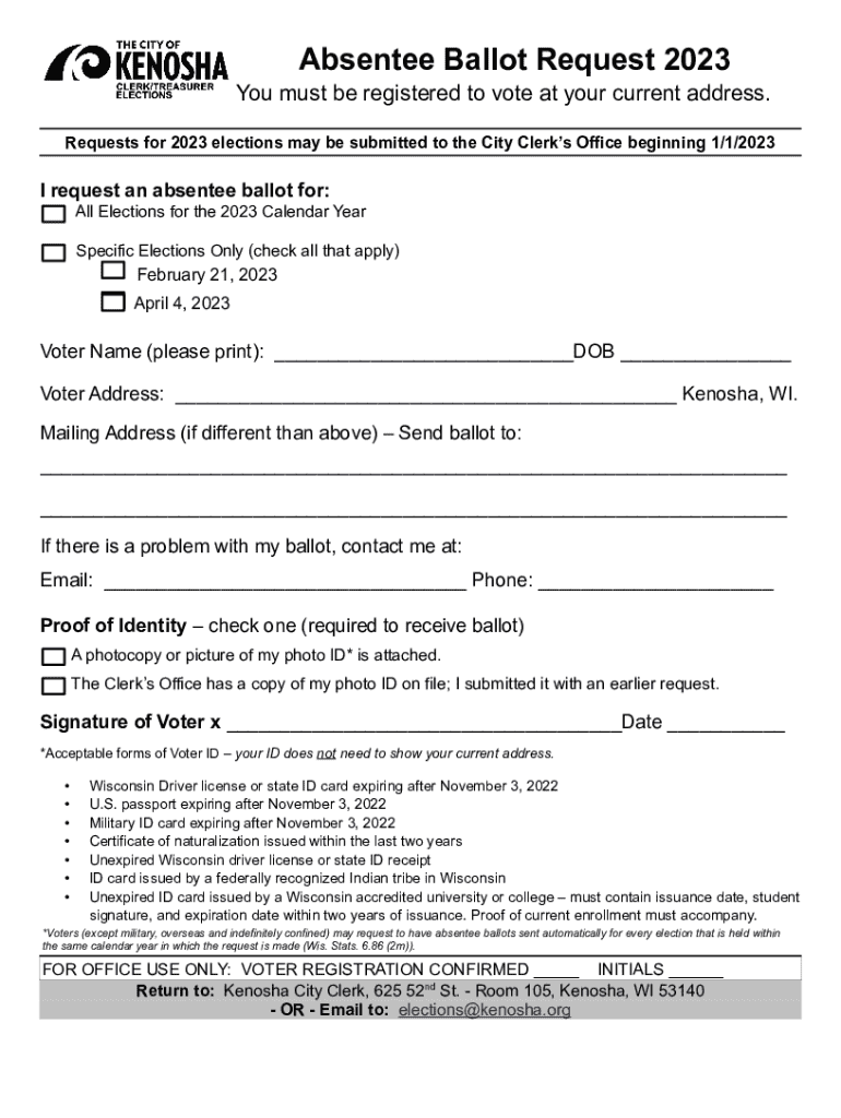 This form is used to request an absentee ballot for the 2023 elections. Voters must be registered at their current address and can request ballots for all elections or specific elections.