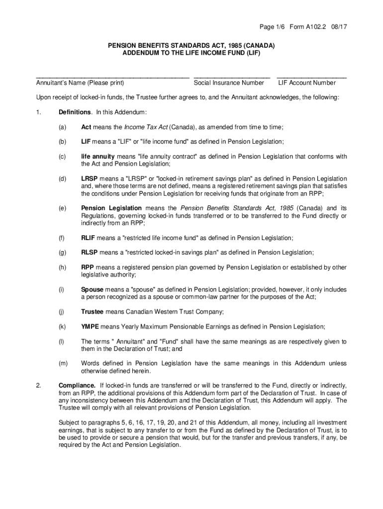 This form outlines the terms and conditions related to the Life Income Fund (LIF) as per the Pension Benefits Standards Act, 1985 (Canada), detailing the management of locked-in funds, compliance