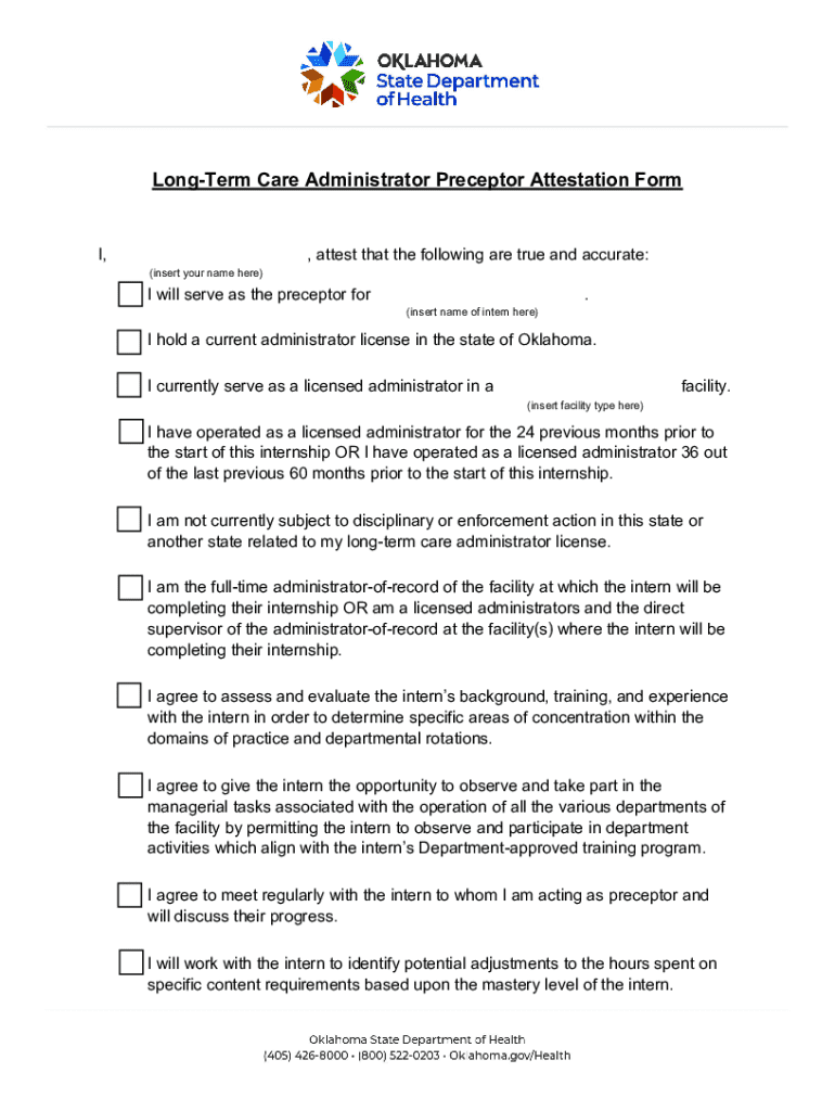 Este formulario sirve como atestado por parte del administrador de un centro de atención a largo plazo que actuará como preceptor para un pasante, confirmando su experiencia, licencias y tareas