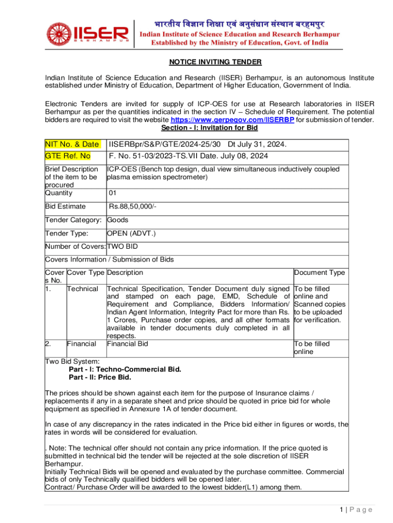 This document invites electronic tenders for the supply of an ICP-OES (Inductively Coupled Plasma Emission Spectrometer) for research laboratories at IISER Berhampur. It details the specifications,
