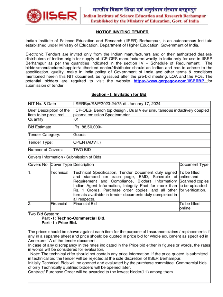 This document invites electronic tenders from Indian manufacturers and authorized dealers for the supply of an Inductively Coupled Plasma Optical Emission Spectrometer (ICP-OES) to the Indian Institute