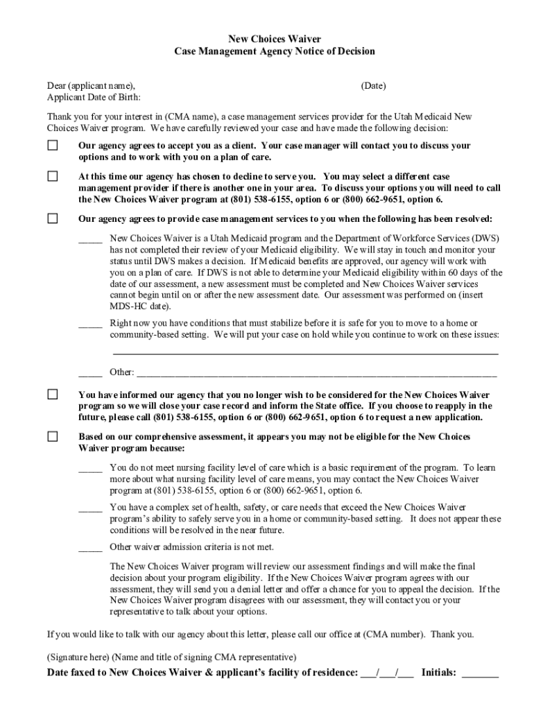 Get the free New Choices Waiver Case Management Agency Notice of Decision