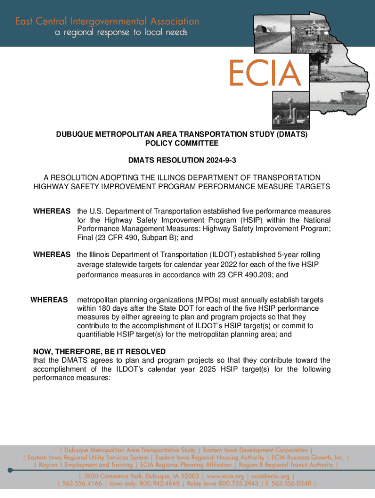 This document outlines the resolution adopted by the Dubuque Metropolitan Area Transportation Study (DMATS) Policy Committee regarding the performance measures set by the Illinois Department of Transportation