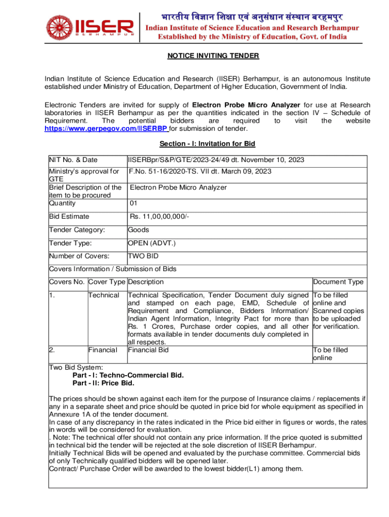 This document invites electronic tenders for the supply of an Electron Probe Micro Analyzer to the Indian Institute of Science Education and Research (IISER) Berhampur. It includes requirements, bid