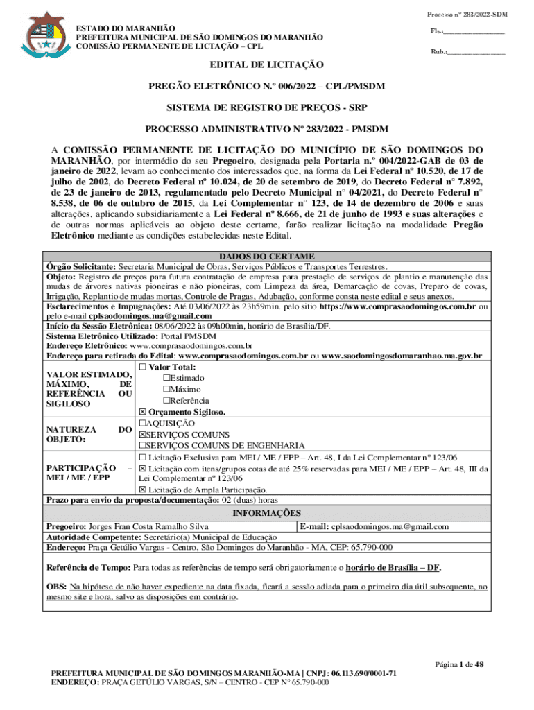 Obtenha o gratuito Edital De Licitação Pregão Eletrônico N.º 006/2022