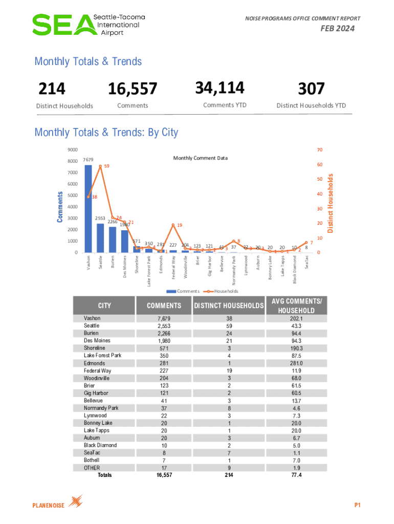 Este informe presenta los totales mensuales y tendencias de comentarios sobre el ruido, incluyendo datos por ciudad y código postal, así como un desglose de los tipos de comentarios recibidos y