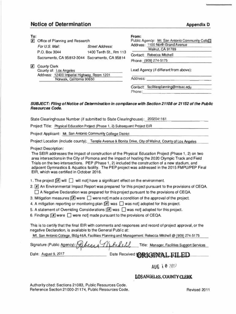 This document serves as a notice complying with Section 21108 or 21152 of the Public Resources Code, regarding the approval of the Physical Education Project (Phase 1, 2) Subsequent Project EIR initiated