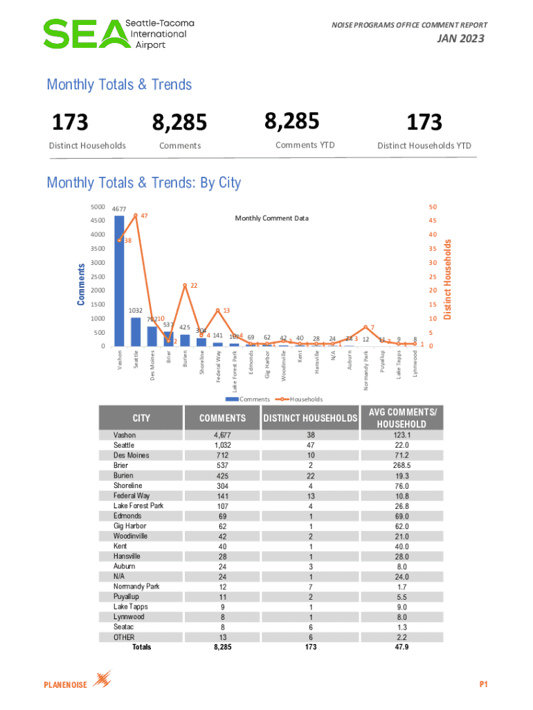 This report presents monthly totals and trends regarding noise comments received by various cities and zip codes, along with distinct households contributing to the comments. It includes data on comment