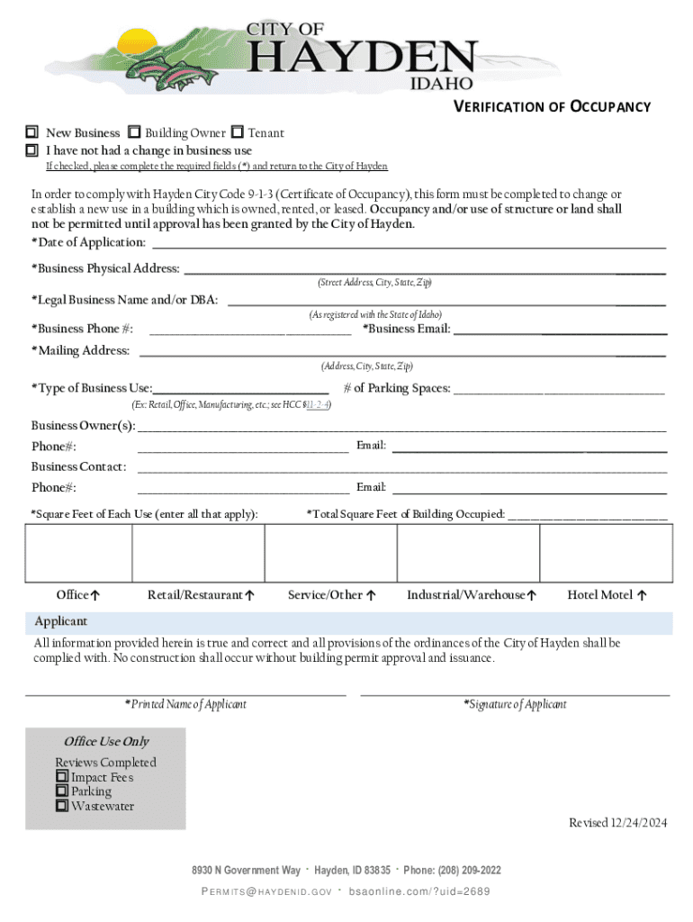 This form must be completed to change or establish a new use in a building which is owned, rented, or leased in order to comply with Hayden City Code 9-1-3 (Certificate of Occupancy).