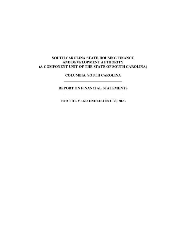 This report details the financial statements and audit results for the South Carolina State Housing Finance and Development Authority, covering various financial activities, management discussions,