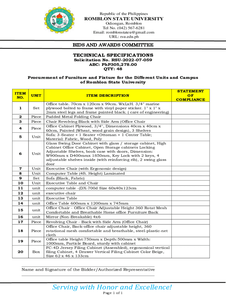 Republic of the PhilippinesROMBLON STATE UNIVERSITY Odiongan, Romblon Tel No. (042) 5676281 Email: romblonstateu@gmail.com URL: rsu.edu.phBIDS AND AWARDS COMMITTEETECHNICAL SPECIFICATIONS Solicitation